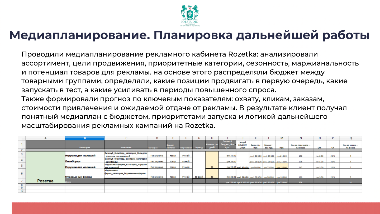 Именно здесь хорошо видна сила бутикового формата JobStudio. Мы не работали по шаблону и не ограничивались одной узкой сферой. Мы глубоко вошли в проект: от аудита и реструктуризации до технической поддержки, промо, ставок, бюджетов и отчетности. Когда команда ведет меньше проектов, она может глубже погружаться в бизнес, быстрее адаптировать стратегию, внимательнее работать с деталями и точнее влиять на коммерческий результат.